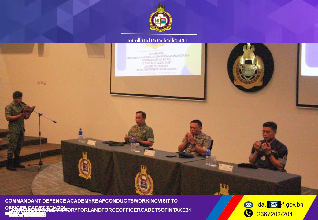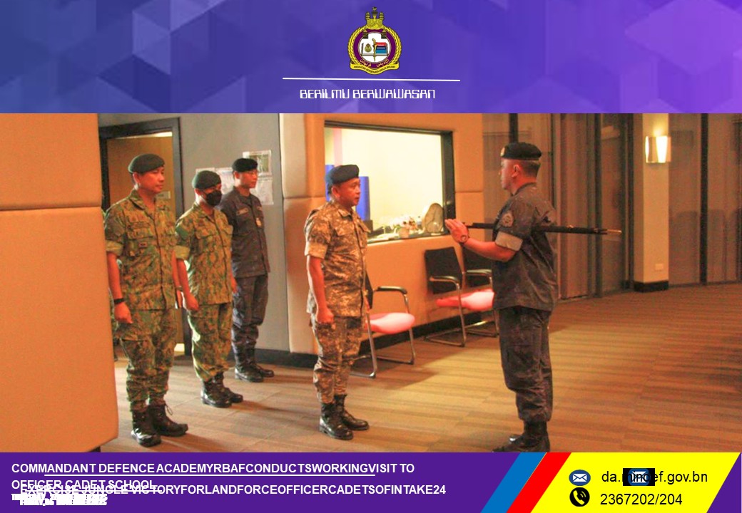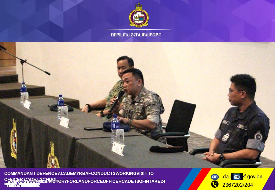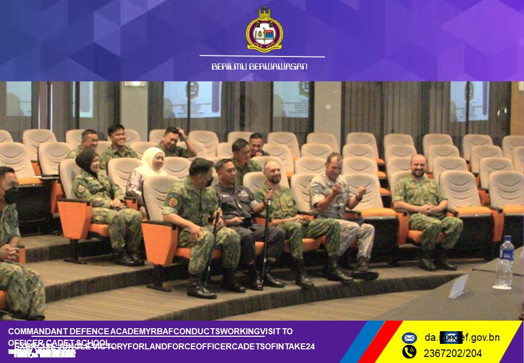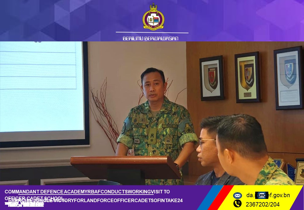 TANAH JAMBU, Thursday, 27 November 2025 – The Officer Cadet School, Defence Academy Royal Brunei Armed Forces (OCS DA RBAF), received a working visit from the Commandant of DA RBAF, Colonel (U) Azmie Iskandar bin Ariffin. Also present was the Deputy Commandant, Adjutant and Academy Sergeant Major of DA RBAF. His arrival was welcomed by Lieutenant Colonel Faizal Azly bin Haji Rosli, Commanding Officer of OCS DA RBAF. The visit commenced with a briefing at the OCS Headquarters, followed by a session between the Commandant and OCS officers and personnel. The engagement reflected the Commandant’s intent to assess OCS’s overall readiness, effectiveness, and ability to deliver professional, high-quality training for future officers. The Commandant then visited OCS infrastructures, including the Officer Cadet Mess Hall and the accommodation block, to observe the current standards, facilities, and training environment. The visit concluded with a luncheon with officers, instructors, and personnel of OCS. SETIA, TAKWA, BERANI.