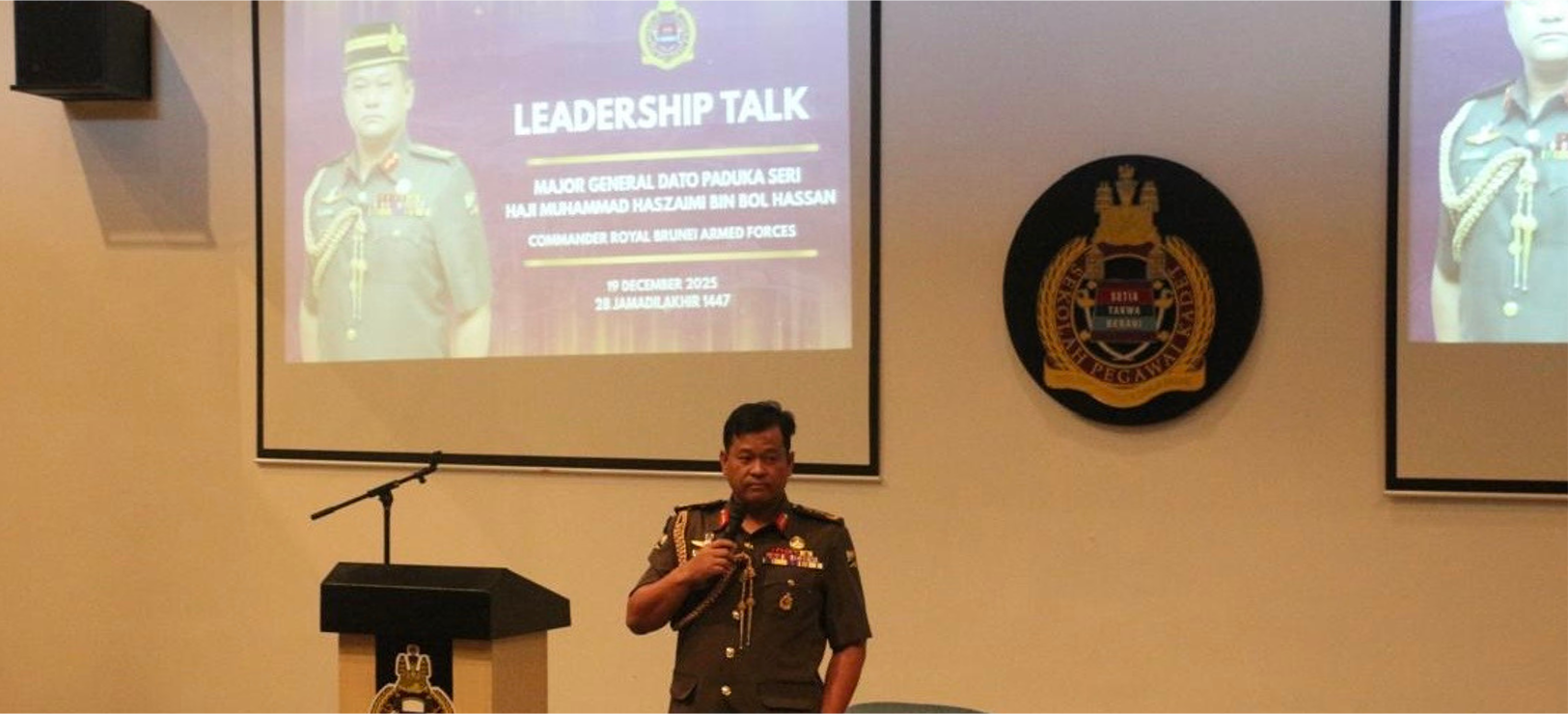 TANAH JAMBU, 19 December 2025 – The Officer Cadets (OCdts) of Intake 24 had the honour of attending a leadership talk delivered by Yang Mulia Major General Dato Paduka Seri Haji Muhammad Haszaimi bin Bol Hassan, Commander of the Royal Brunei Armed Forces (RBAF), at the Lecture Hall, Officer Cadet School, Defence Academy, Royal Brunei Armed Forces (OCS DA RBAF).